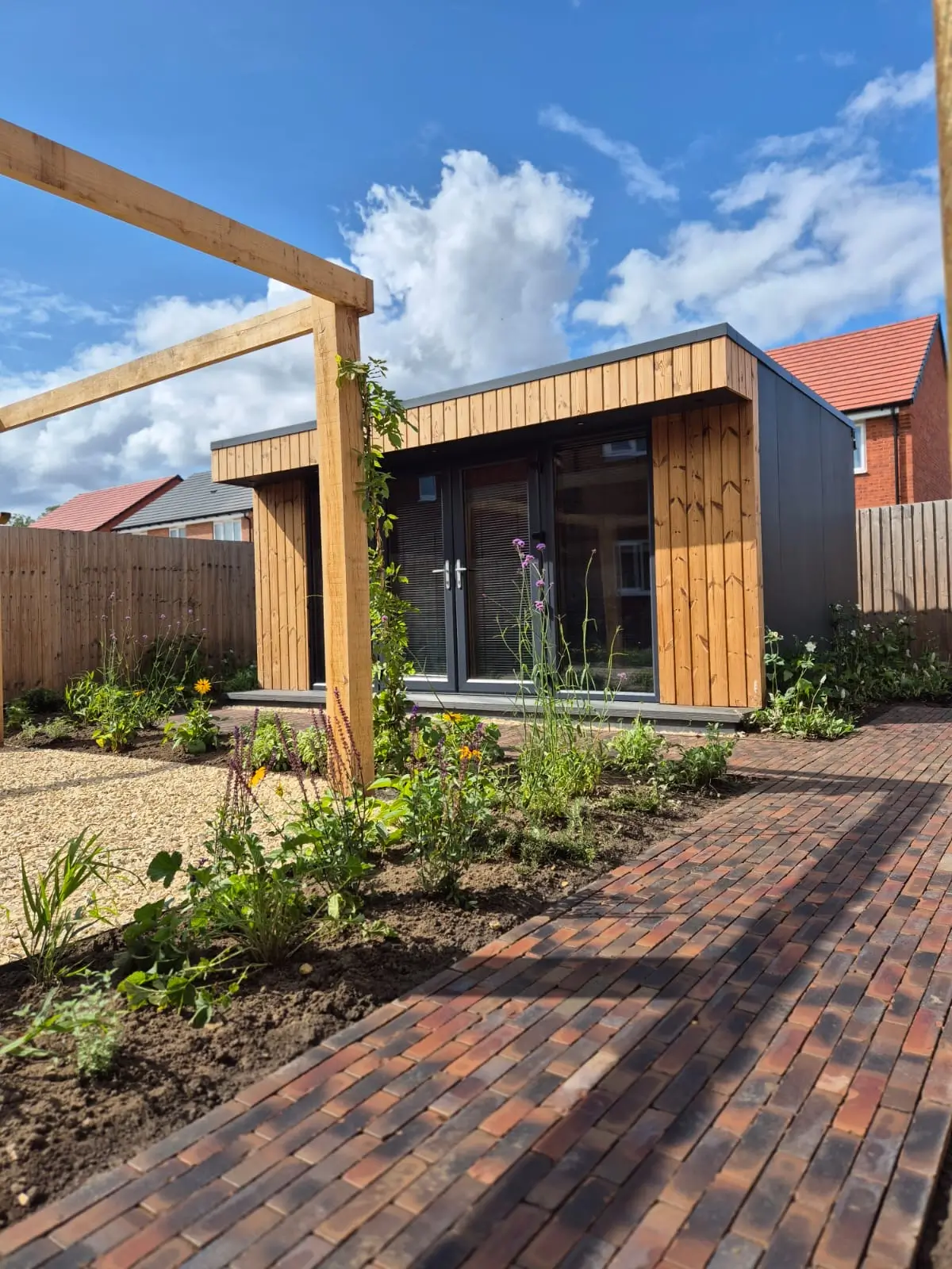 A palette of aged timbers was introduced to give the garden an immediate sense of maturity and character. Long-flowering, pollinator-friendly planting provides year-round seasonal interest while supporting bees, butterflies, and other wildlife.